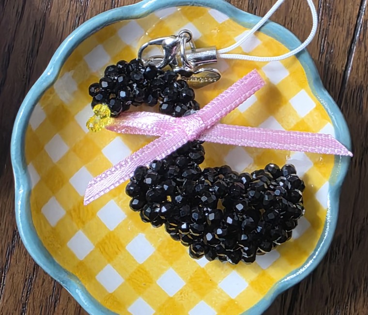 可愛らしい黒鳥模様のビーズポンストリングで、深くて魅惑的な黒胴と繊細なディテールが魅力的です。